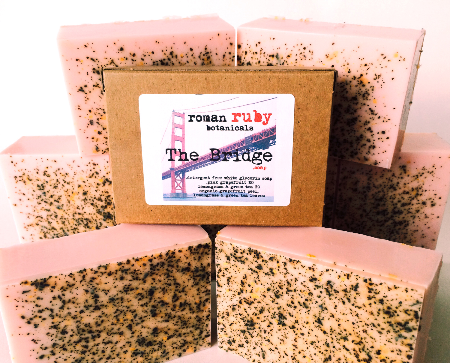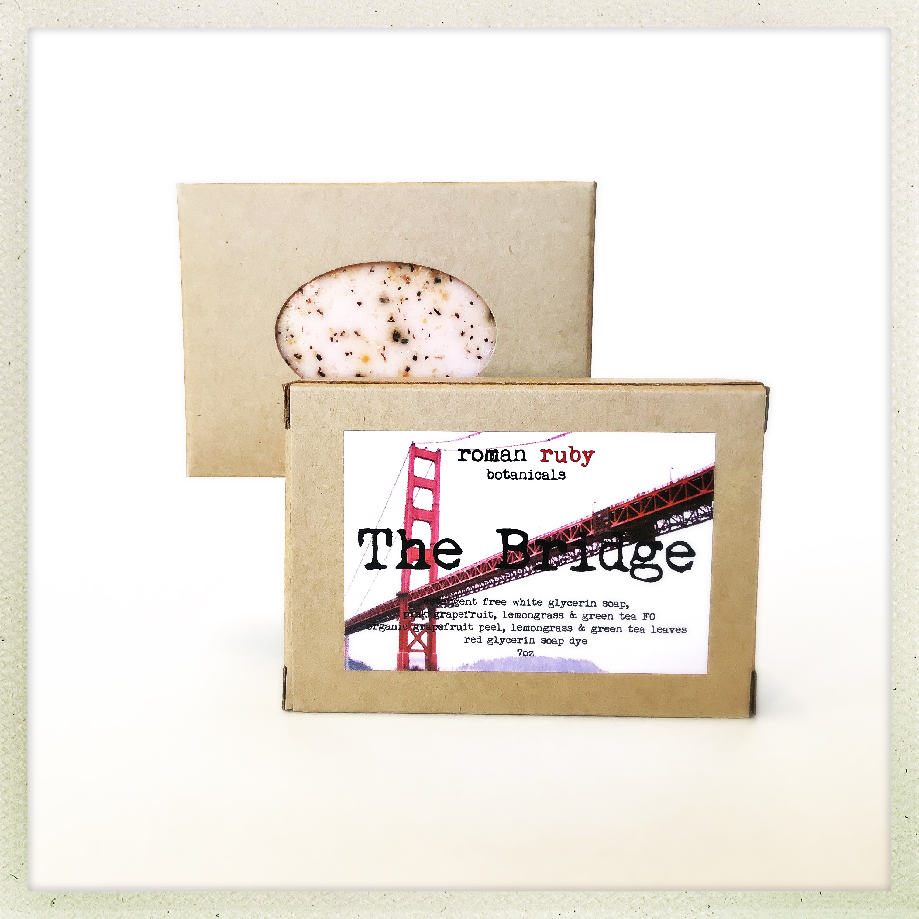 The Bridge Soap scent is inspired by the invigorating vibration of life in this awesome city. Scented with uplifting pink grapefruit essential oil & the sweet scent of lemongrass & green tea fragrance. This soap is enjoyed by both men and women. The red soap bar is sprinkled with lemongrass and green tea leaves and organic pink grapefruit peel.