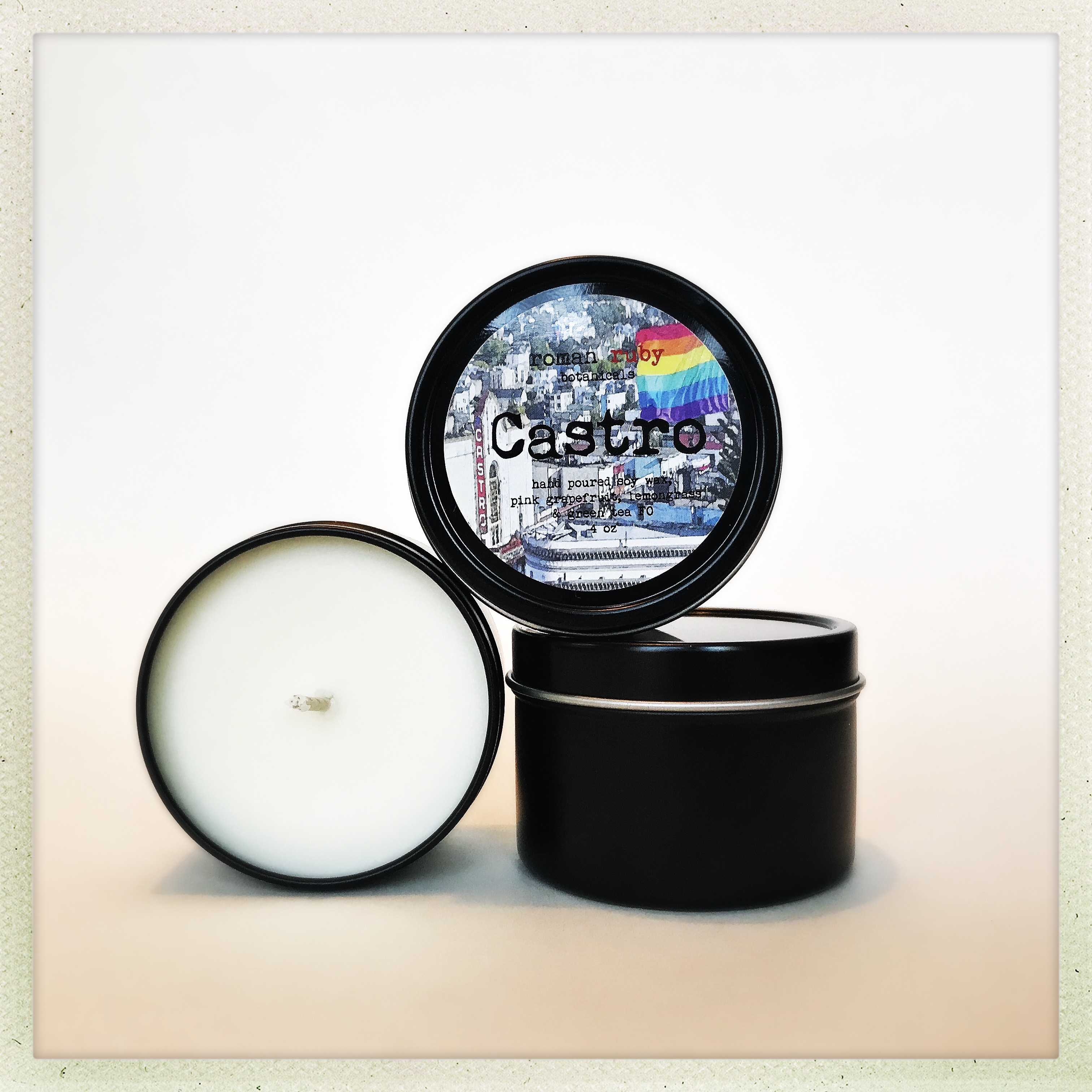 The Castro candle is a kaleidoscopic mix of pink grapefruit with a touch of lemongrass and green tea.