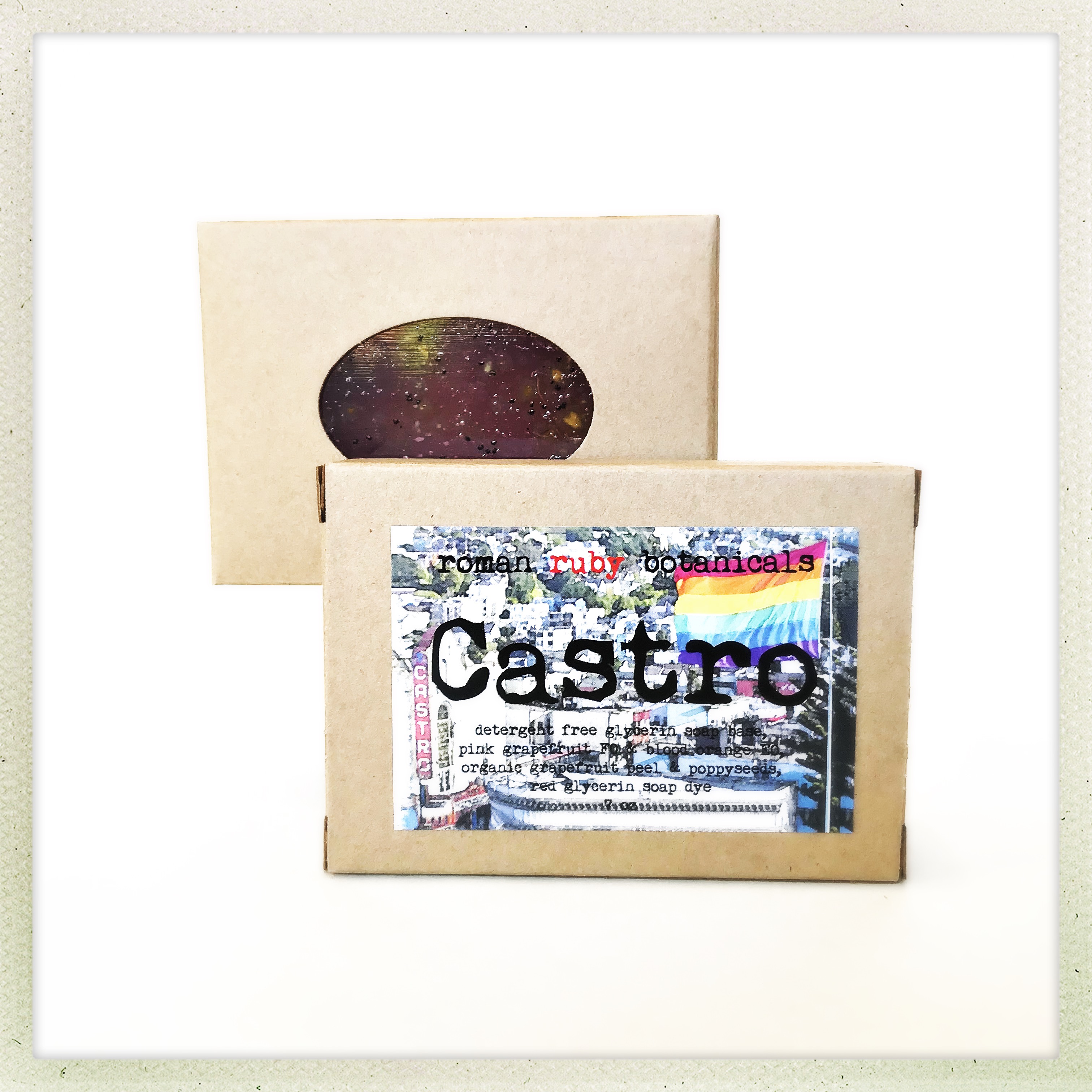 Castro soap is a kaleidoscopic mix of pink grapefruit and Peppermint. You'll be ready to conquer this energetic neighborhood full of shopping, dining and cocktails. This playful hot pink soap bar is made with organic pink grapefruit & poppy seeds.