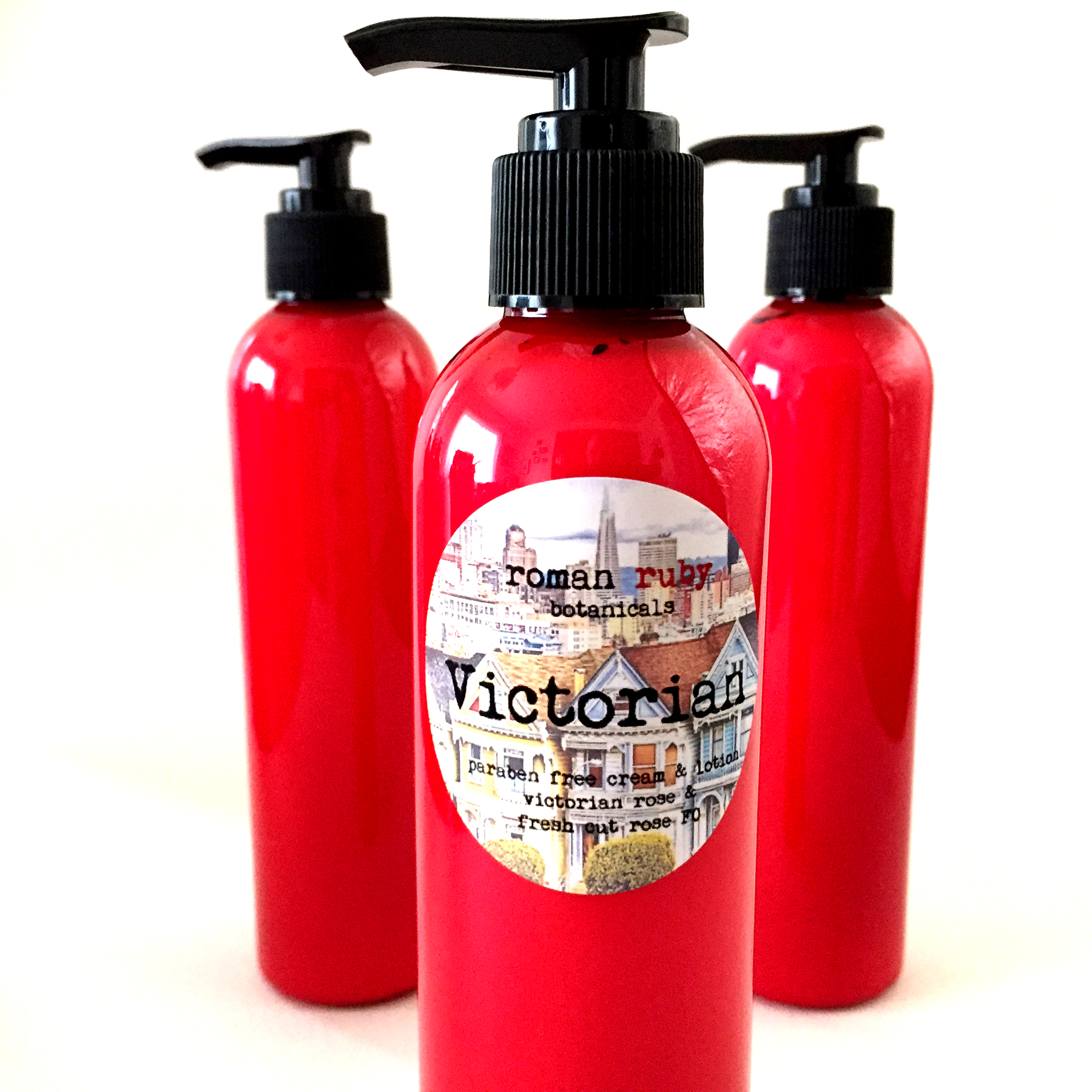 This Victorian 8 oz lotion is classically scented with a unique combination of Victorian rose and fresh cut rose to give you the whole experience of smelling a rose garden; the fragrant petals along with the fresh green scent of it's stem and leaves.